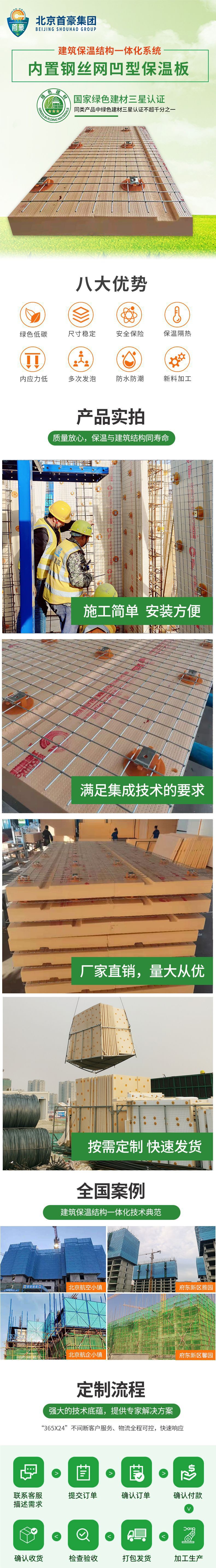 內(nèi)置鋼絲網(wǎng)凹型保溫板系統(tǒng)是北京首豪集團(tuán)專利產(chǎn)品,其導(dǎo)流槽專利設(shè)計(jì),業(yè)界獨(dú)立完美解決了砼搗振不順,導(dǎo)致的空腔、塌落度不足、芯材時(shí)效位移等難題。是在低內(nèi)應(yīng)力型復(fù)合保溫板基礎(chǔ)上進(jìn)行優(yōu)化創(chuàng)新的產(chǎn)品。更加符合節(jié)能和建筑工業(yè)化的要求,可全程實(shí)現(xiàn)標(biāo)準(zhǔn)化生產(chǎn),是建筑保溫與結(jié)構(gòu)一體化的最新型產(chǎn)品。